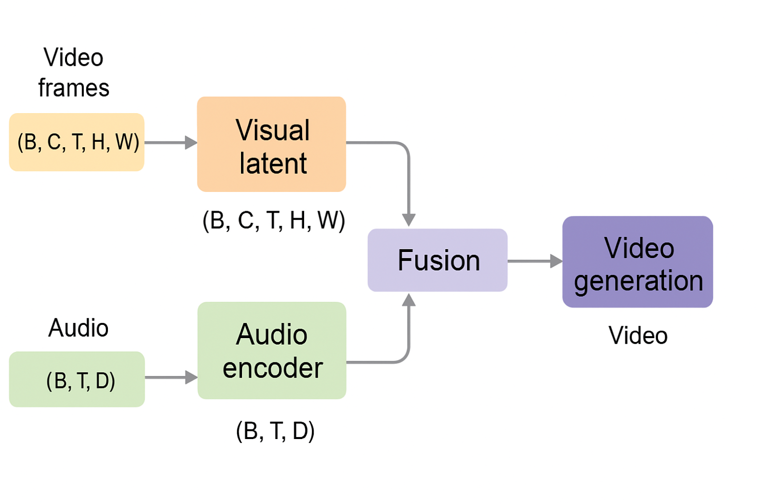 This tensor is aligned along the same time axis (T) as the visual latent. Fusion occurs by conditioning or joint processing, allowing correlations such as: