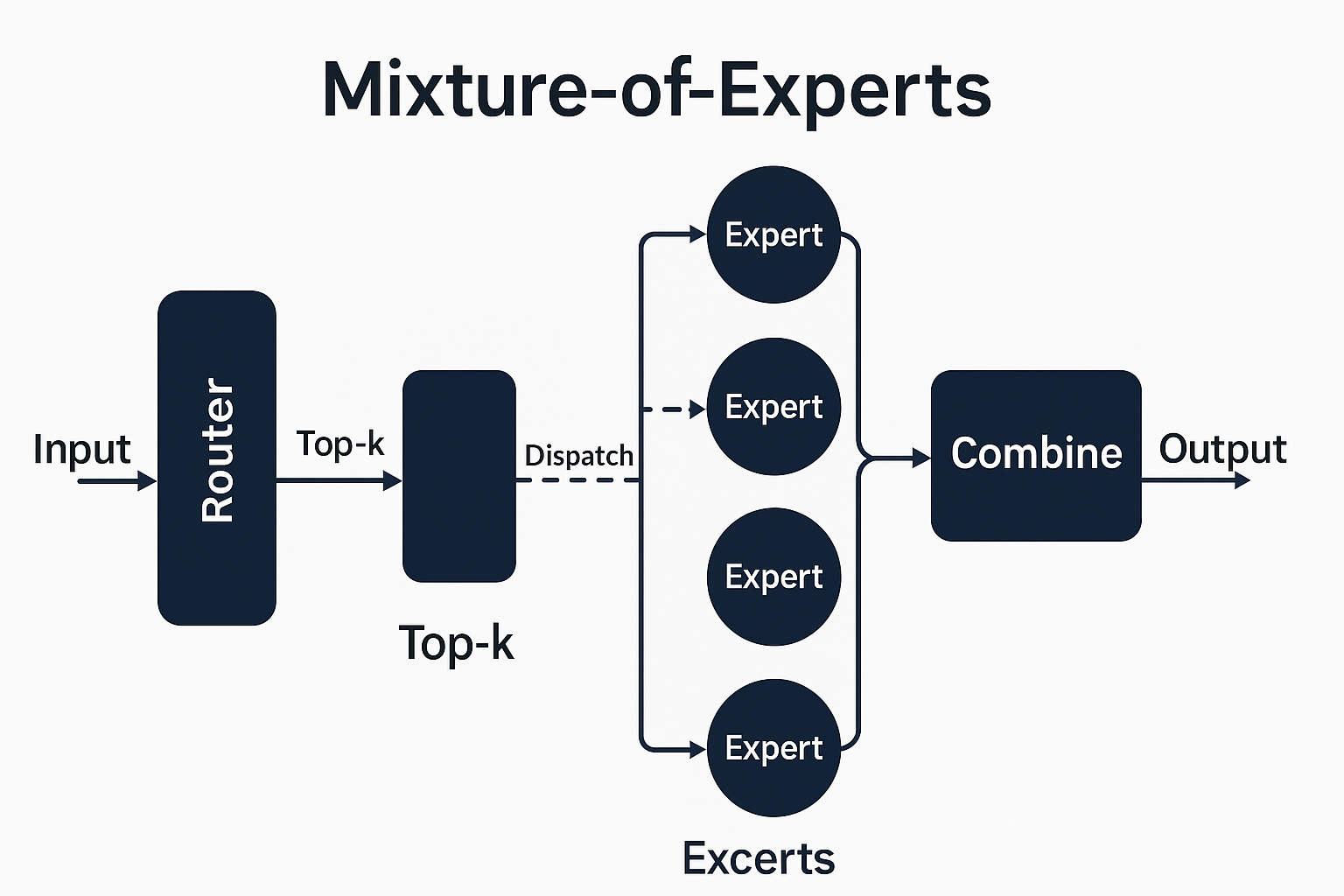 MoE replaces dense MLPs with a bank of experts but activates only top-k experts per token.