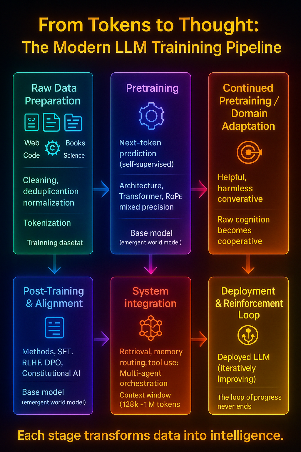 Every major foundation model—GPT, Claude, Gemini, Llama, Mistral—passes through a three-phase evolution: pretraining, continued pretraining, and post-training. Each stage expands a model’s intelligence from pattern recognition to reasoning and alignment.